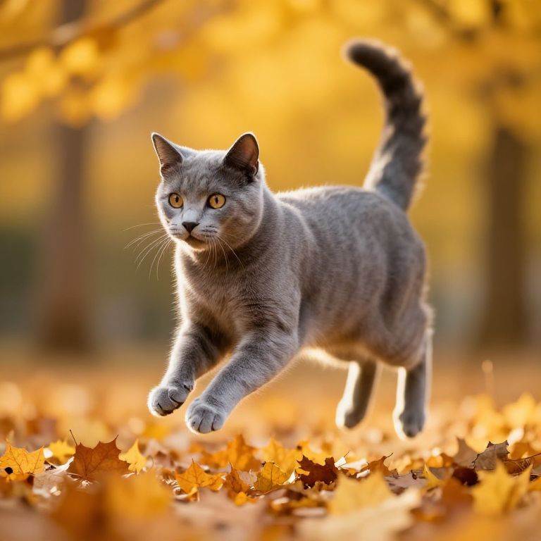 Playful Russian blue cat tabby leaping among autumn leaves, sharp fur pattern visible with soft focus background of golden trees and warm sunlight filtering through