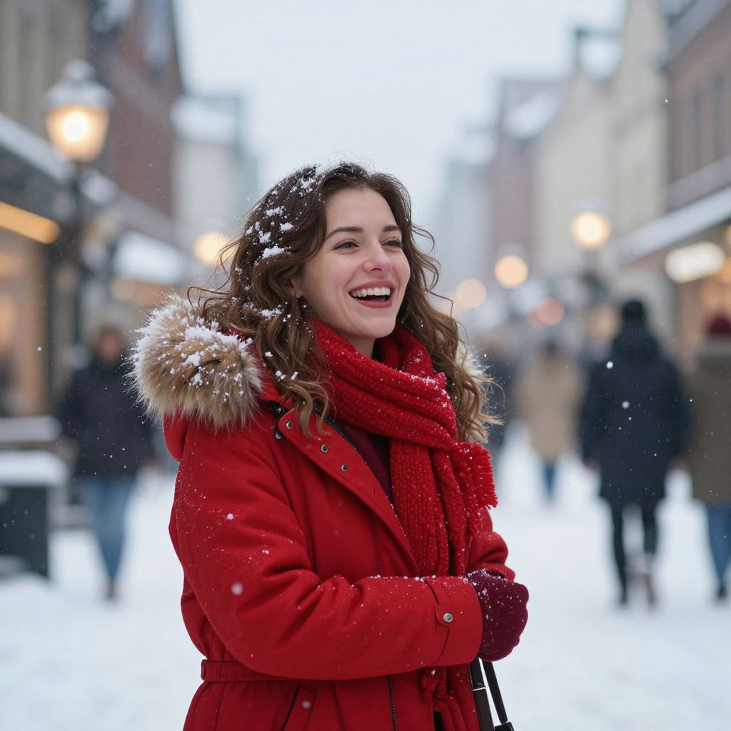 Radiant warmth pierces the winter chill as a smiling woman in vibrant red embraces the festive spirit, her laughter echoing through the snowy streets like a beacon of hope and joy amidst the season’s quiet serenity.