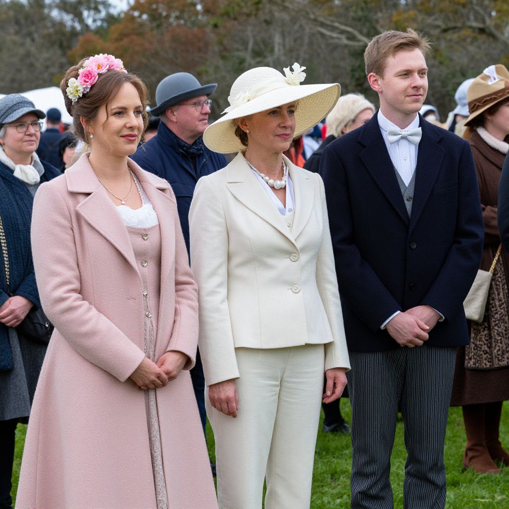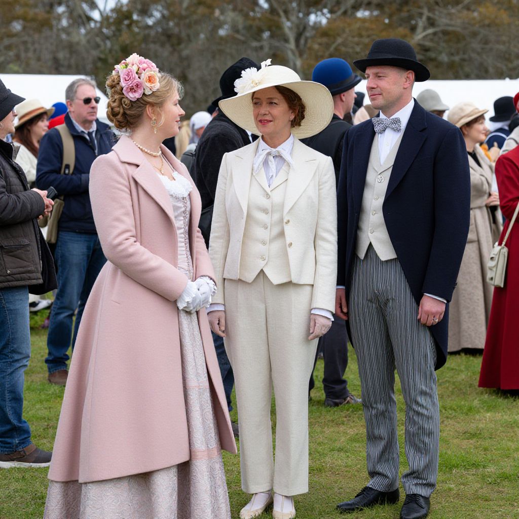 Gympie's Ultimate Steam Festival showcases a vibrant gathering of attendees dressed in elaborate period costumes, featuring a woman in a pastel pink coat with floral headpiece, another in a cream suit with wide-brimmed hat, and a man in a formal navy suit with striped trousers and bow tie, all standing amidst a lively crowd on a grassy field.