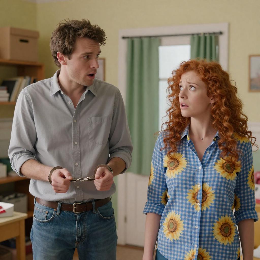Photograph of a man and woman with red hair and brown hair, both bound with rope and sitting back-to-back on a black chair. The woman wears a blue shirt, the man a white shirt. Background includes office furniture, a painting of a face, and a desk with photos and a coffee maker. Both have neutral expressions. Office setting with beige walls and red accents.