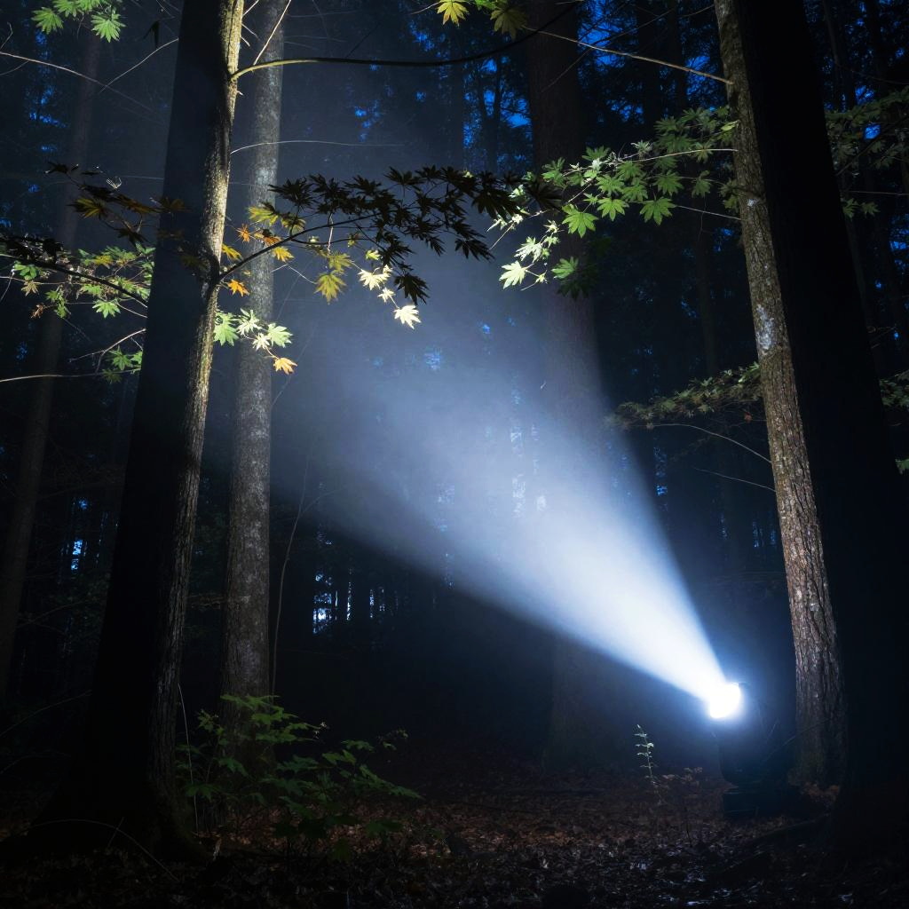 Flashbang flashburst illuminating a dense forest at night, bright white-blue light casting eerie shadows on trees and fog, mystical ambiance with photo-realistic details and sharp focus on the light source