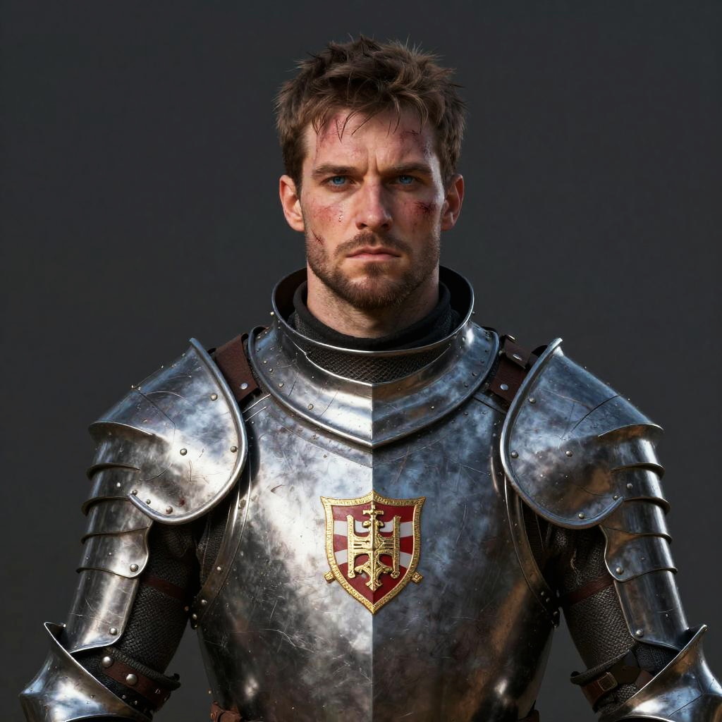 Realistic photo.Henry, a knight and protector, characterized by strong build, battle scars, and piercing blue eyes, wearing shining plate armor with a crest, highly detailed and realistic rendering. realistic photo