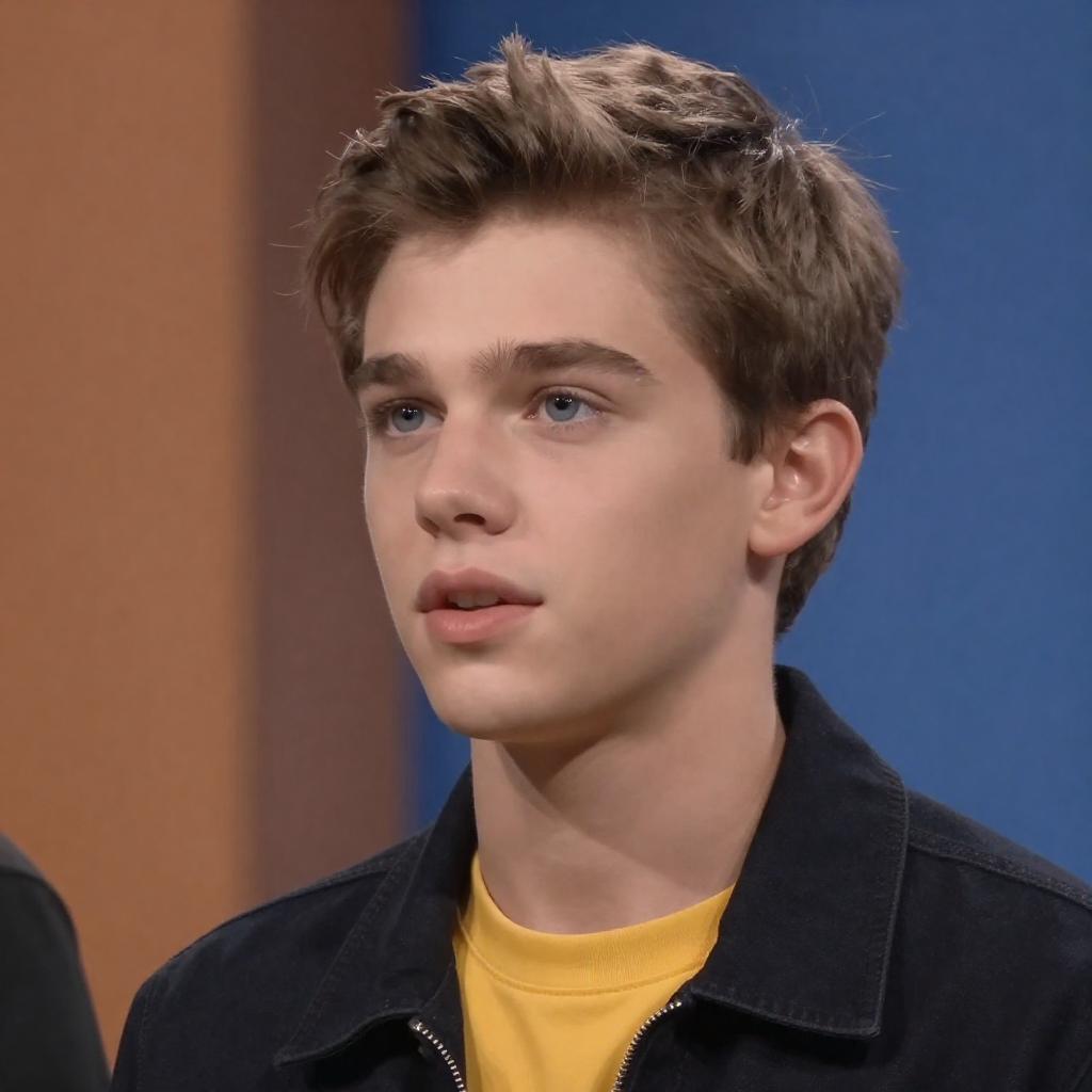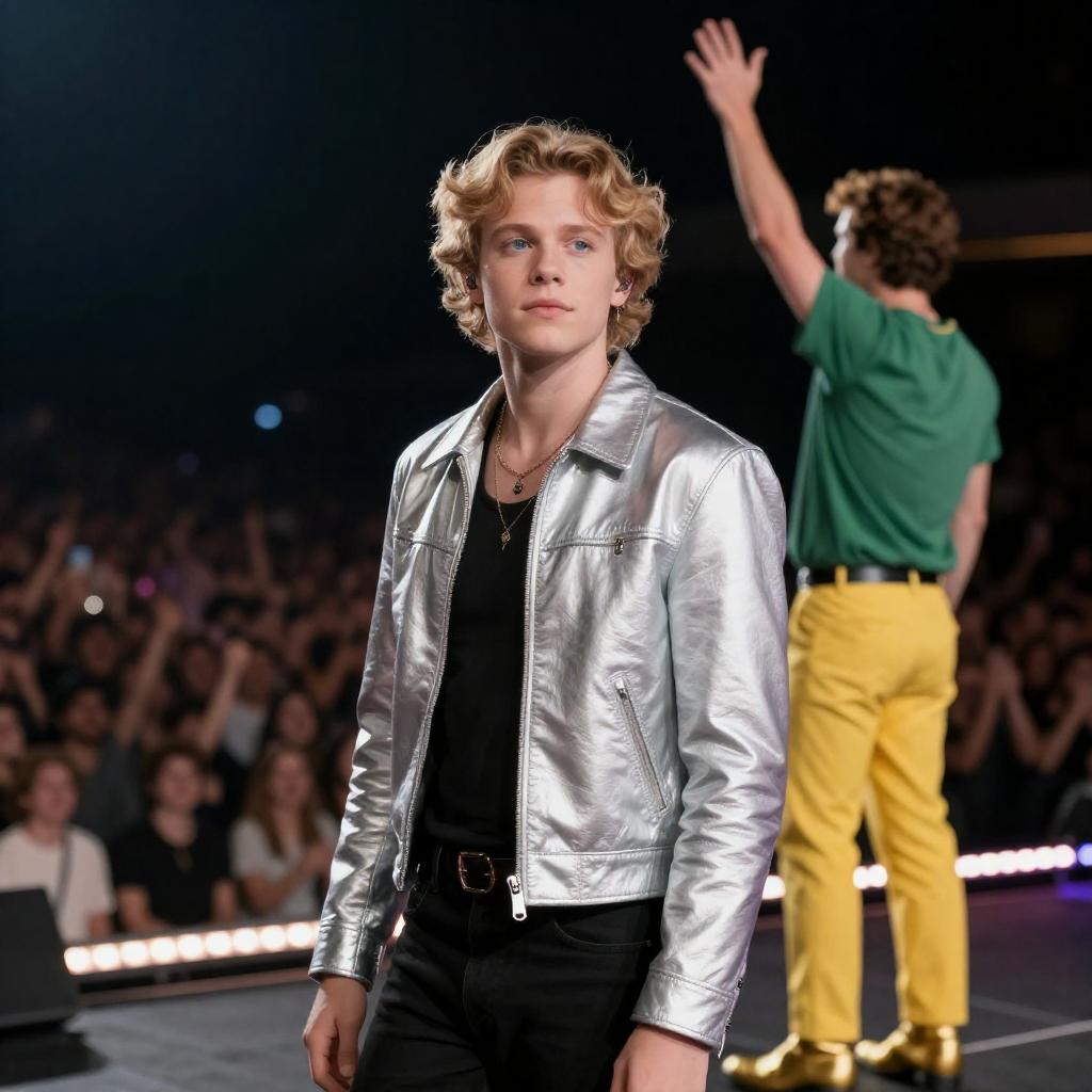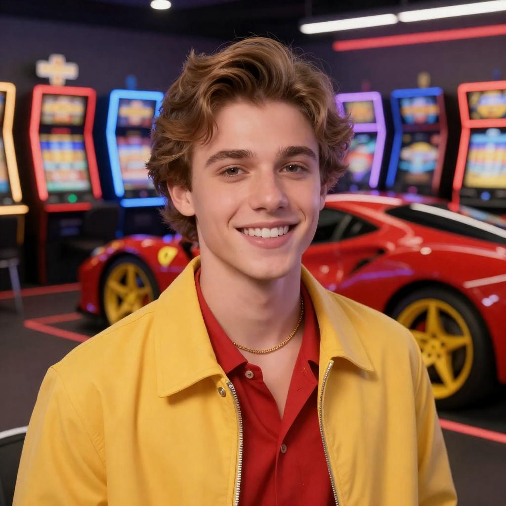 Photograph of a young man with light brown hair, wearing a yellow jacket, red shirt, and gold necklace, smiling. Background includes neon-lit slot machines and a red Ferrari with yellow wheels. Man in foreground, Ferrari slightly behind. Bright, colorful setting.