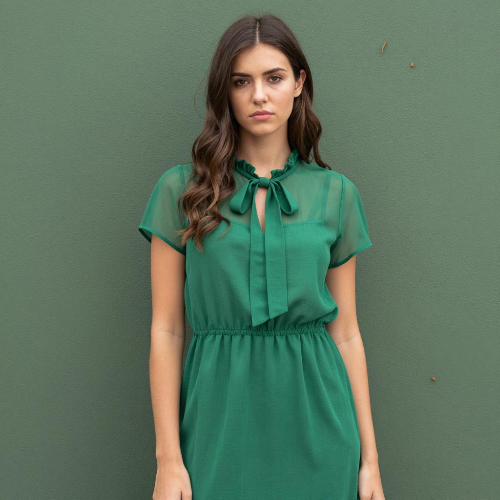 Green chilindrina dress, photograph of young woman with long brown hair, wearing green dress with sheer sleeves and ribbon collar, standing against green ured wall, natural light, serious expression, casual style, summer outfit, subtle autumn leaves on wall background, realistic detail