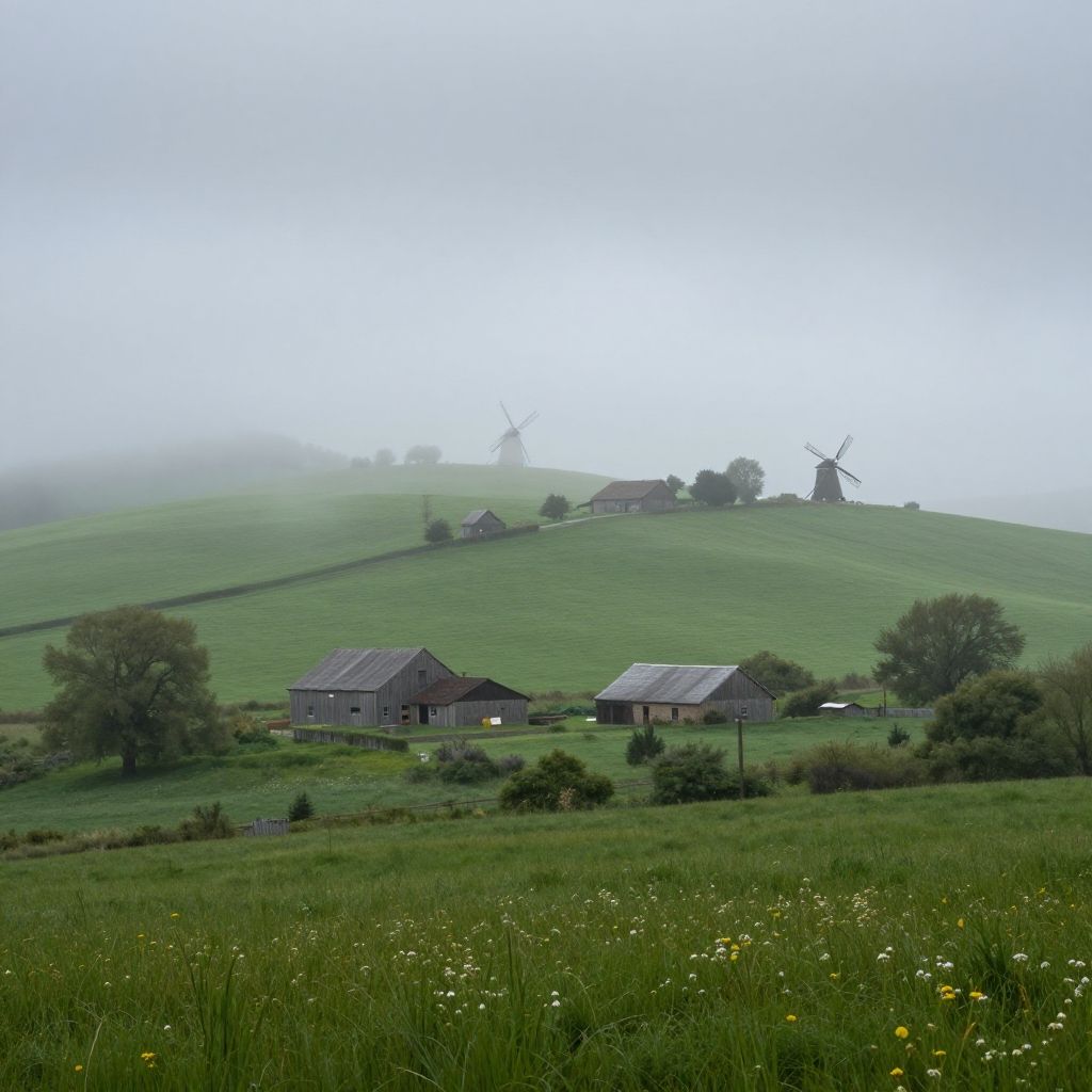 Mist village on rolling hills under a grey sky, rustic barns and windmills partially hidden by swirling mist, wildflowers in the foreground, a hauntingly beautiful rural setting