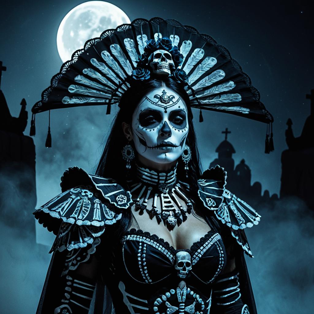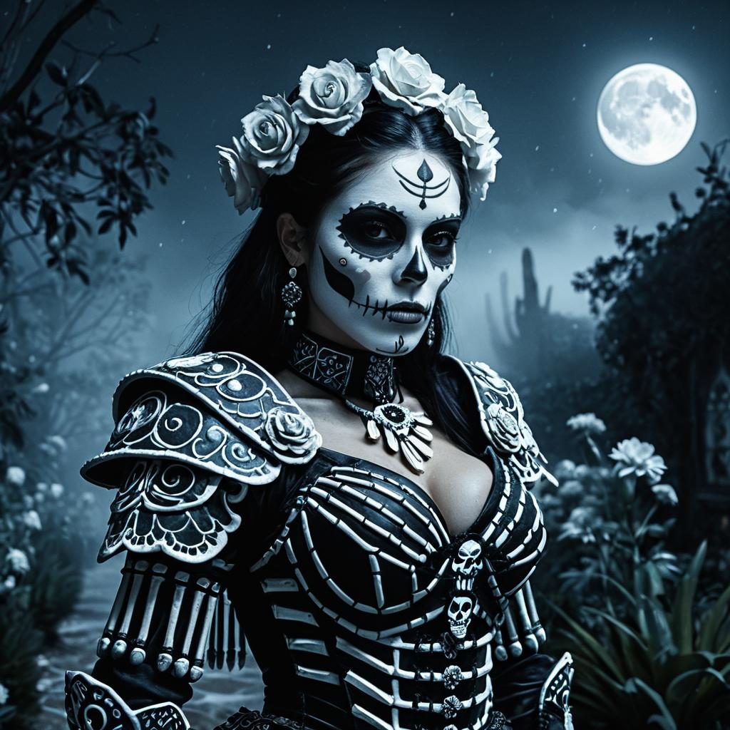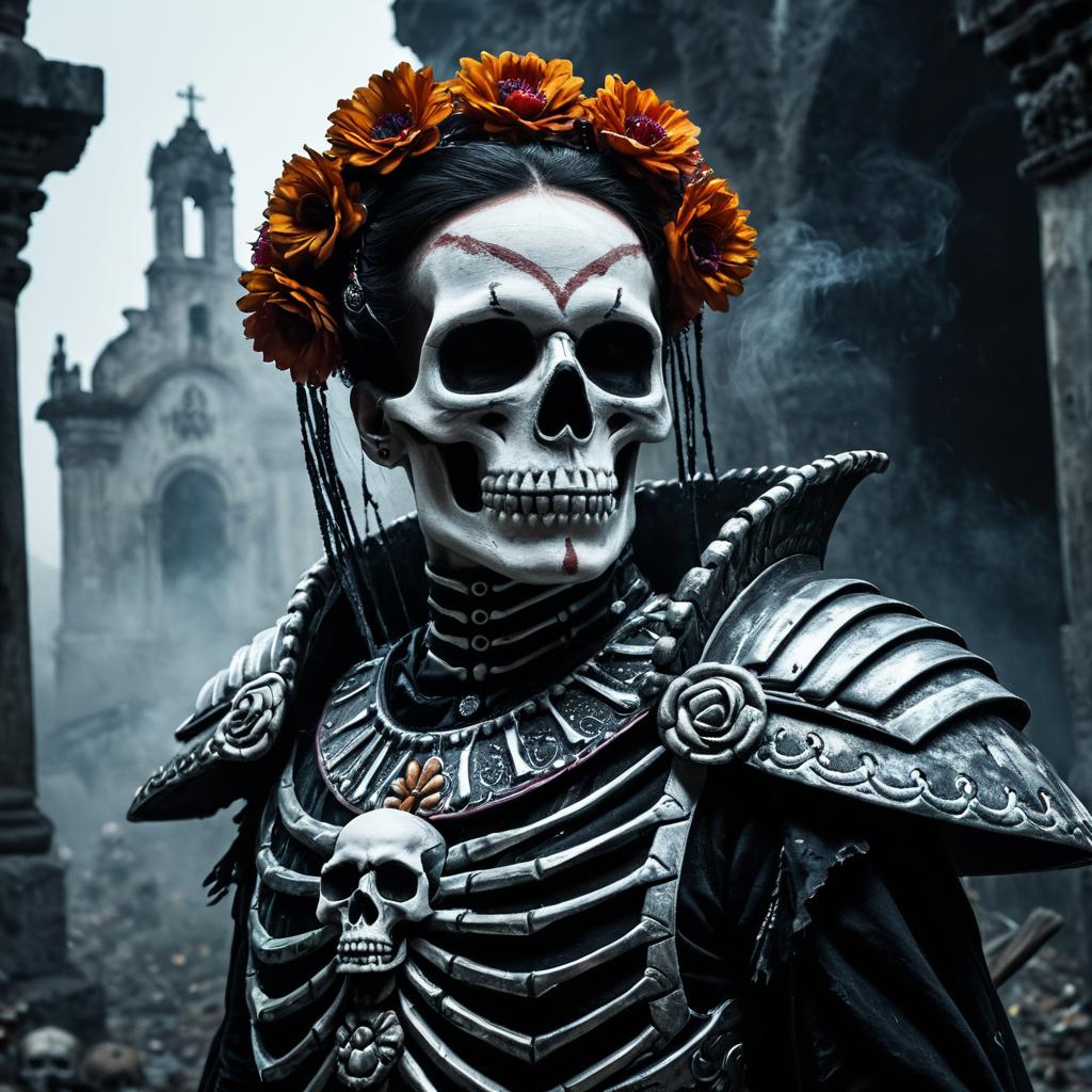 Female phantom assassin in intricate skeletal armor, photo realistic, ultra detailed portrait, sharp skeletal visage, la Catrina dia de los muertos, volumetric fog, Hyperrealism, breathtaking, ultra realistic, cinematic lighting, moonlit moon gate