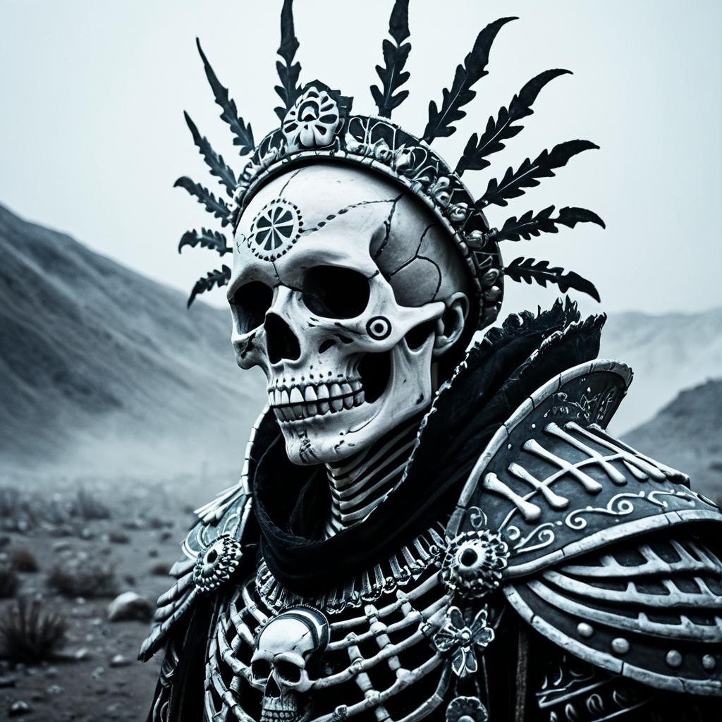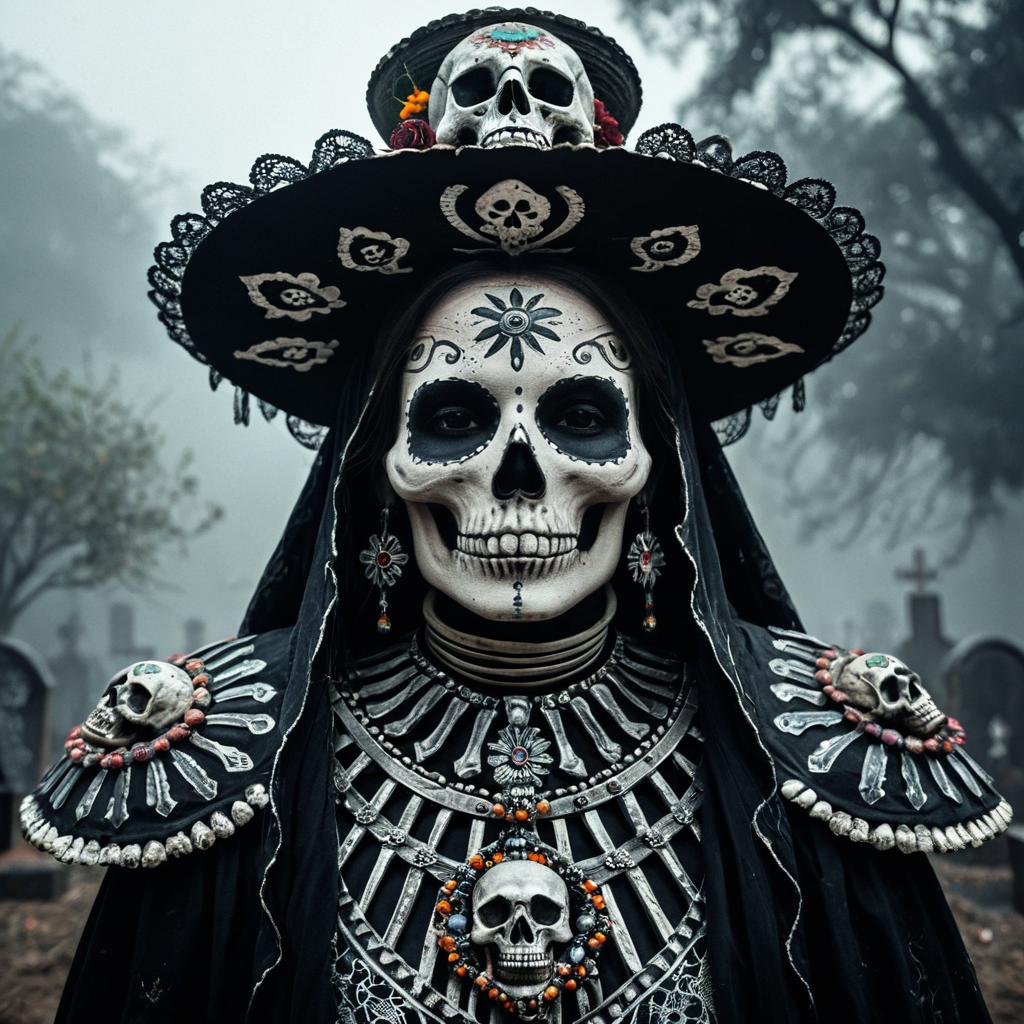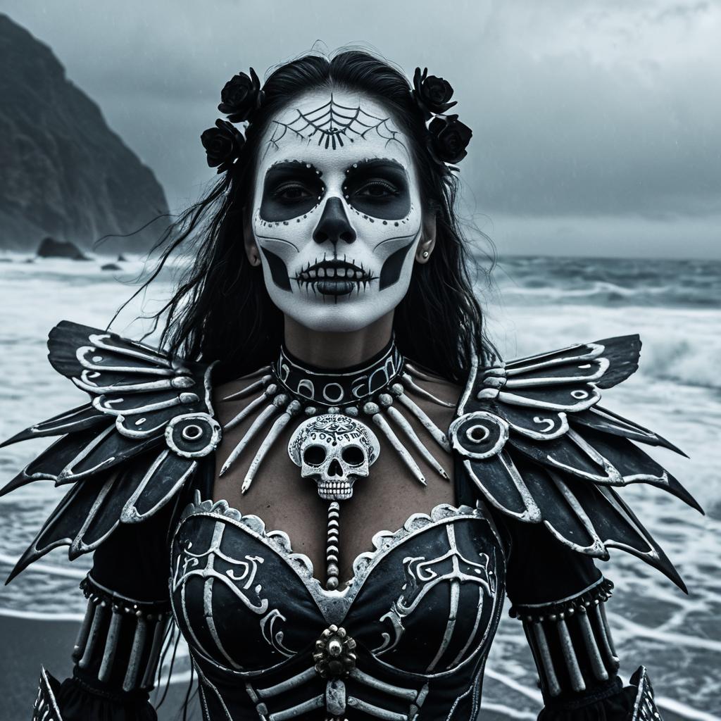 Female phantom assassin in intricate skeletal armor, photo realistic, ultra detailed portrait, sharp skeletal visage, la Catrina dia de los muertos, volumetric fog, Hyperrealism, breathtaking, ultra realistic, cinematic lighting, moonlit moon gate