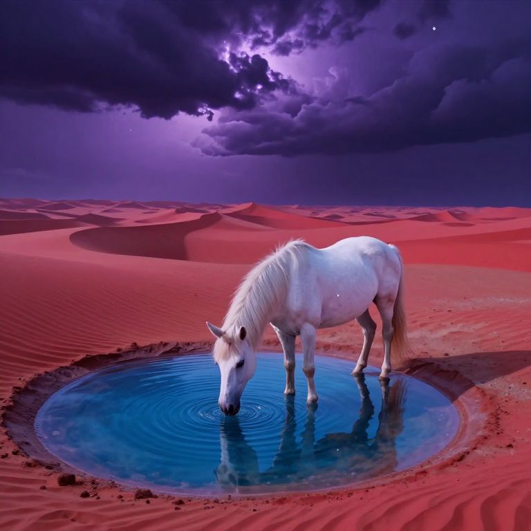 Digital artwork depicting a white horse with a sleek, glossy coat drinking from a circular, calm blue waterhole in a vast, surreal desert. The desert is filled with vibrant red sand dunes, textured with ripples. The sky above is dramatic, with dark purple and black clouds illuminated by a bright, purple lightning bolt. The horse's reflection is visible in the water, adding to the mystical atmosphere. The overall scene combines elements of fantasy and surrealism, with vivid colors and striking contrasts. The horse stands in the center, slightly to the right, with its head lowered to drink.