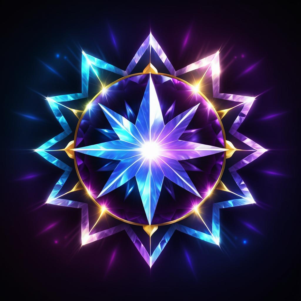 Digital illustration of a vibrant star-shaped gem emitting intense glowing light effects. The gem features bright blue, purple, and yellow hues with sharp reflective surfaces, set against a dark background to emphasize its luminosity and radiant energy.