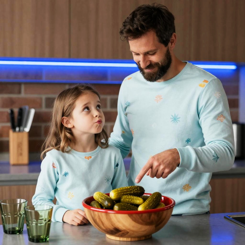 Photograph of a man and a young girl in matching light blue pajamas with colorful patterns, standing at a kitchen island. Man has dark hair, short beard, smiling, leaning towards girl. Girl with light brown hair, pouting, looking at large red bowl of pickled vegetables. Wooden bowl of pickles in foreground, green glass tumblers on left. Brick wall background, knives in holder, blue LED lighting. Man's right hand points at bowl, girl's left arm rests on counter.