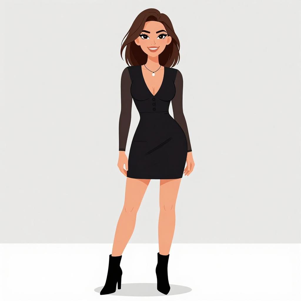 Digital illustration of a smiling, fair-skinned woman with long brown hair, wearing a black, strapless, sparkly mini-dress, holding a