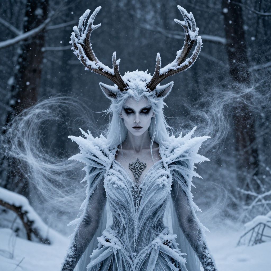 Photograph of a pale, ethereal woman with long white hair, snow-covered antlers, and intricate icy armor, standing in a snowy forest.