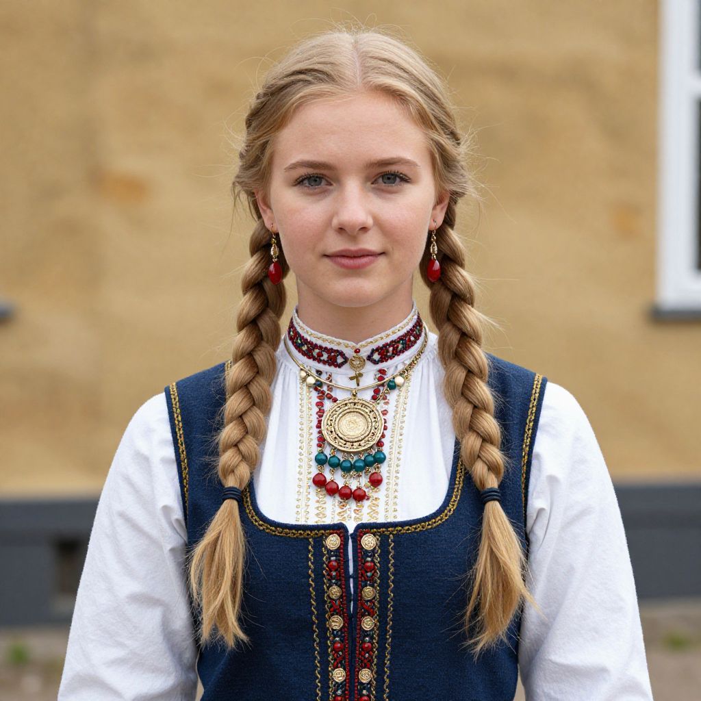 Danish folk costume, 1girl, solo, blonde hair, braid, jewelry, earrings, realistic, looking at viewer, long hair, twin braids, gloves, upper body