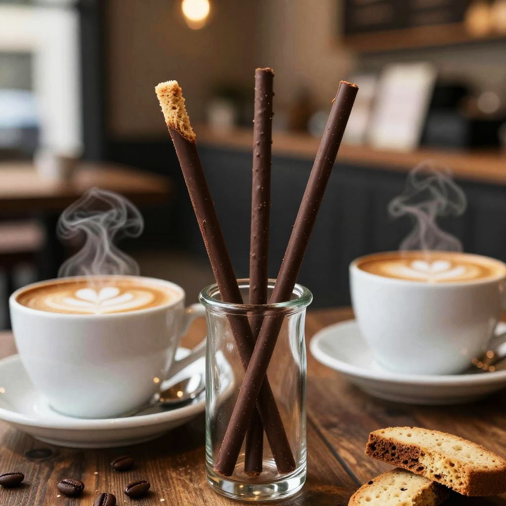 Edible coffee stirrers elegantly crafted from chocolate and biscotti, placed in steaming cups of cappuccino with a cozy café background, warm lighting, and rustic textures.