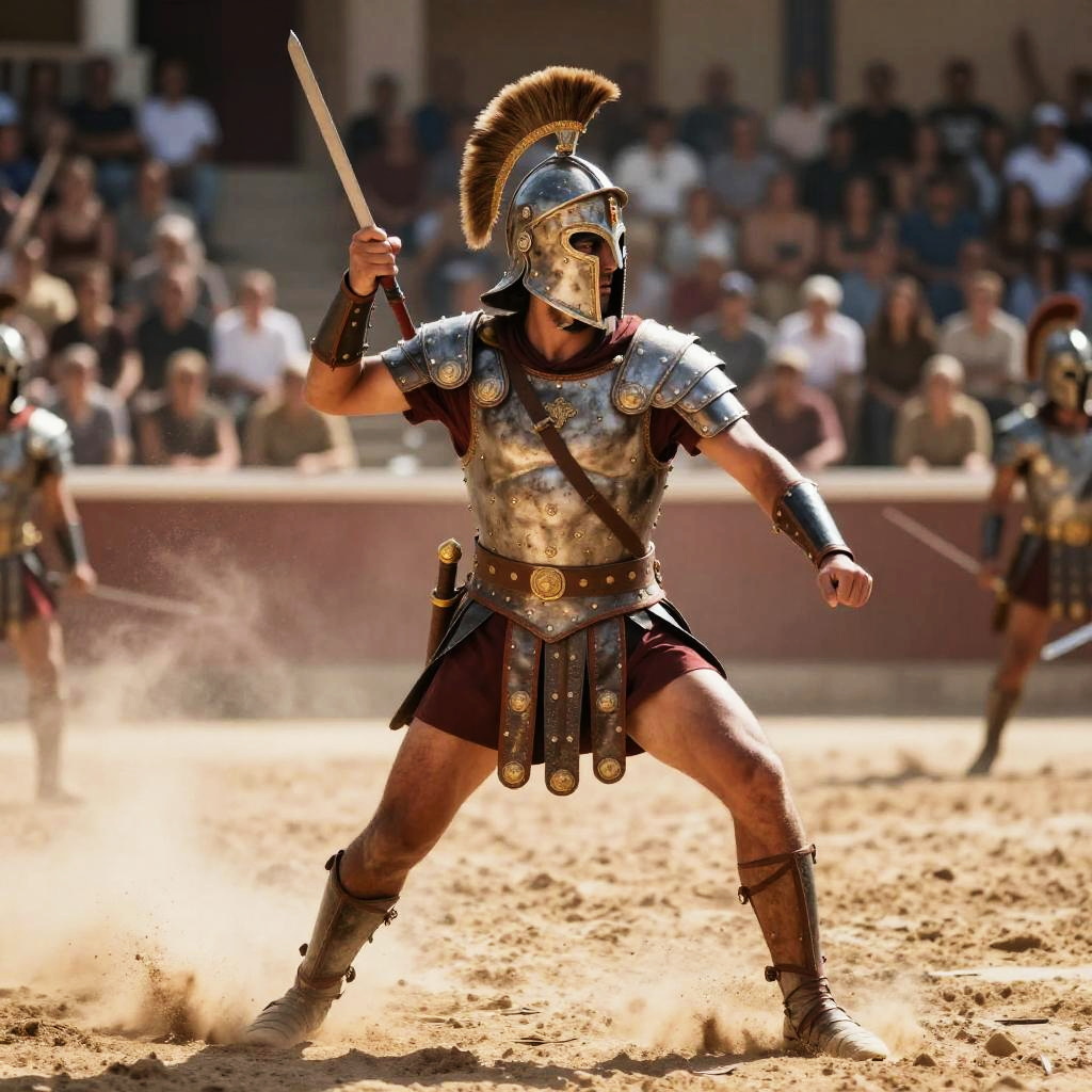 Epic scene of a retiarius gladiator in arena wearing distinctive retiarius helmet, dynamic pose, dusty sand, cheering crowd, cinematic lighting, heroic atmosphere