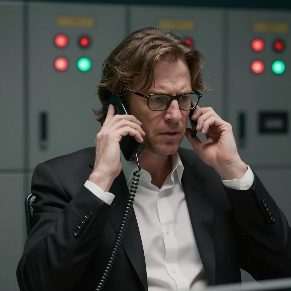 Man with medium-length brown hair and glasses, wearing a black suit over a white shirt, talking on a phone in a dimly lit control room. Dark gray control panels with red and green lights in the background. Man's right hand on the phone, left hand near his head. Intense expression on his face. Control panels occupy the entire background. One person.