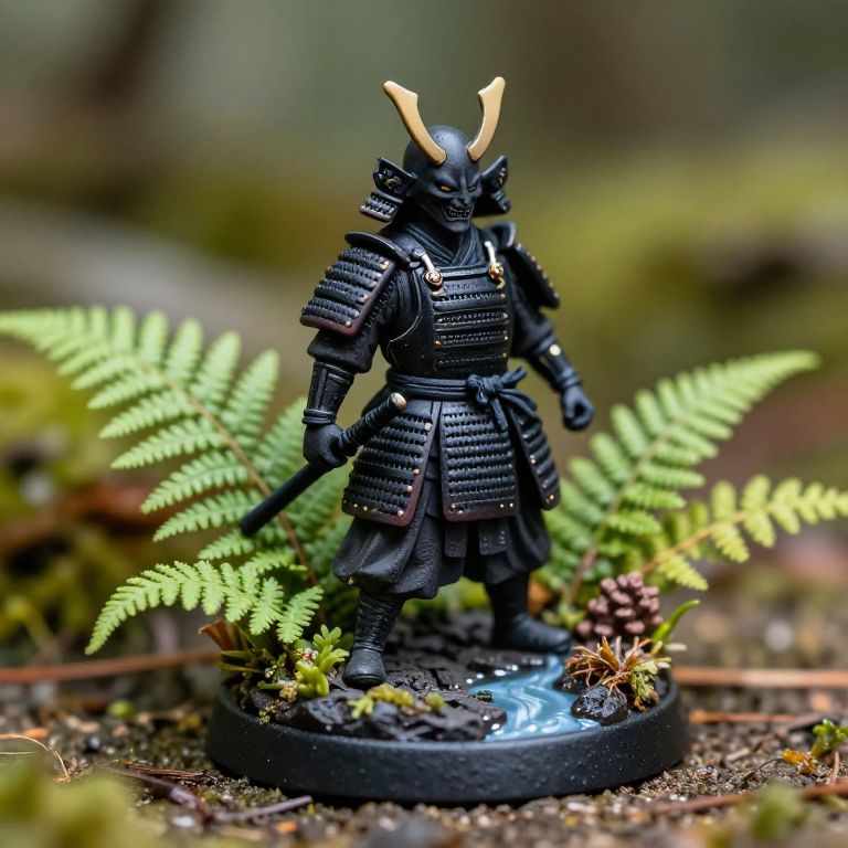 Mescaline a samurai miniature, demonic aspect, on a base decorated with ferns and a small creek. Black armour. Photo realistic, tilt shift,