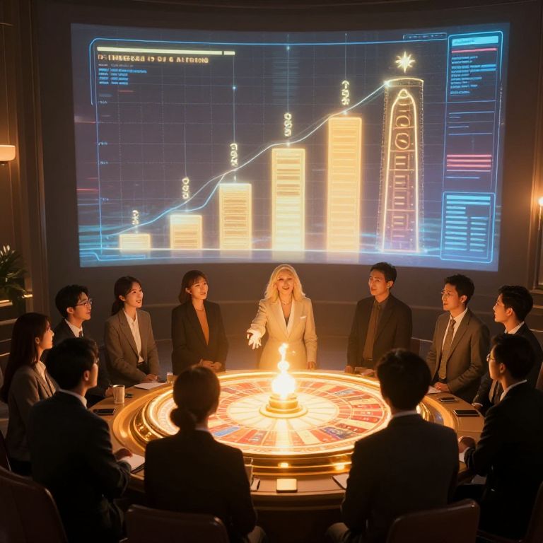 Photograph of a business meeting around a glowing circular table, illuminated by a candle, with a financial projection display behind. Diverse professionals in suits,