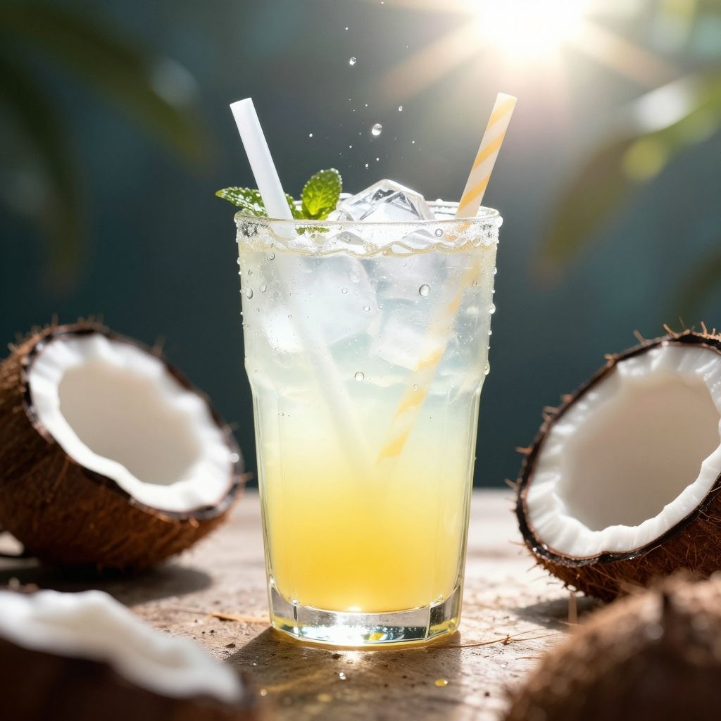 Photograph of a refreshing coconut drink with ice cubes, a straw, and mint garnish, surrounded by halved coconuts and sunlight.