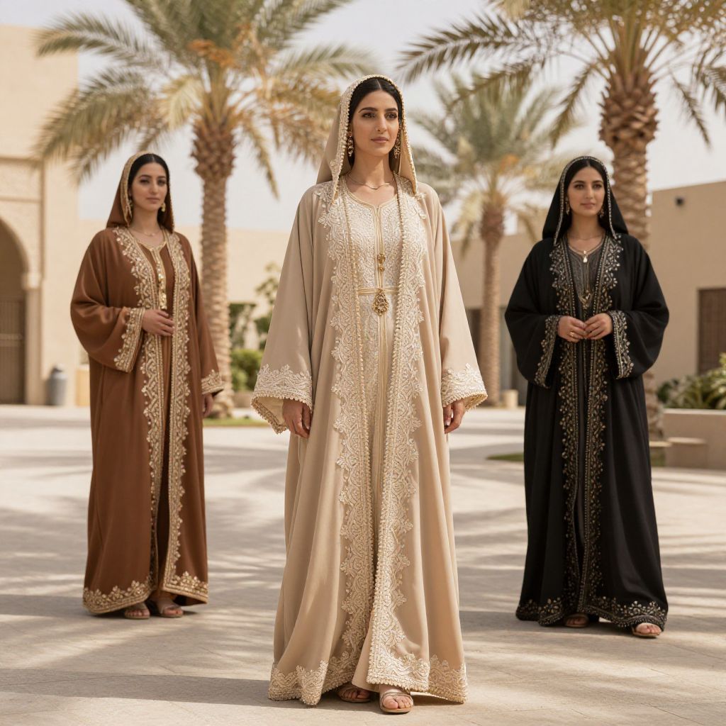Arabic garments displayed in a serene desert oasis, women in flowing robes and abayas, intricate lace and bead embellishments, natural sunlight highlighting fabric details, palm trees in background