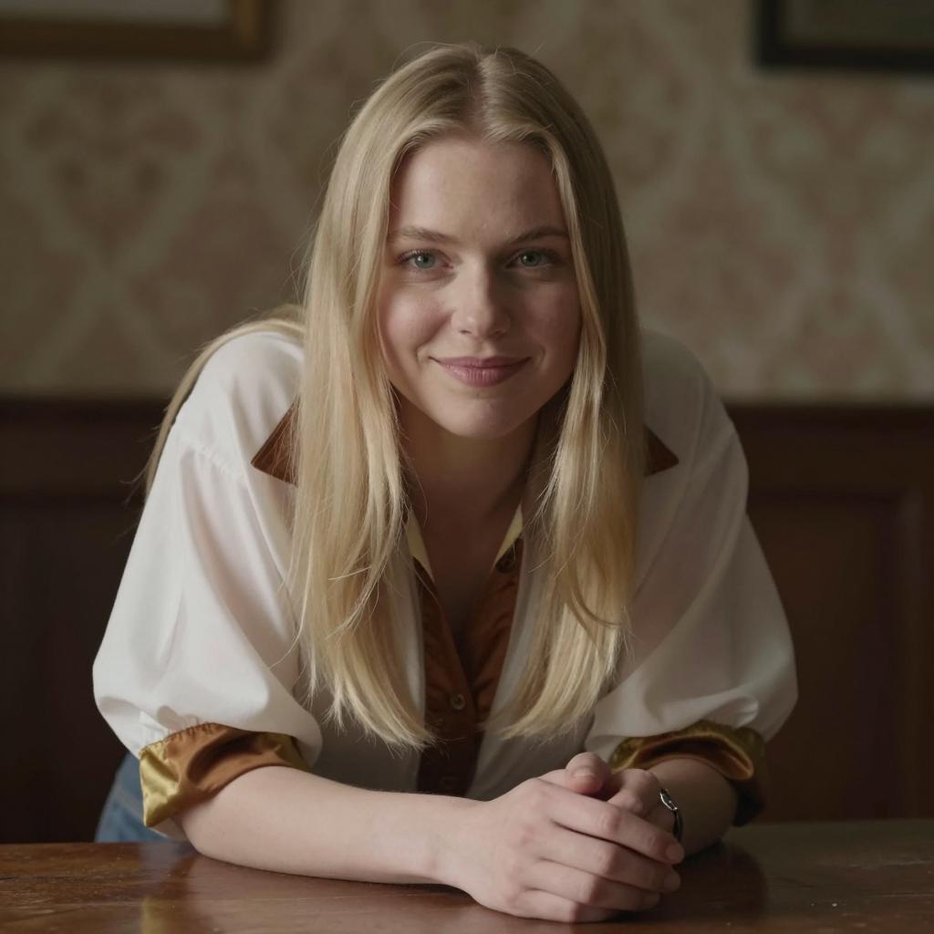 Blonde woman with straight hair, lying on a wooden surface, smiling softly, wearing a white shirt with brown and gold accents. Hands rest in front, fingers slightly interlocked. Patterned wallpaper in the background, dimly lit. Warm lighting.