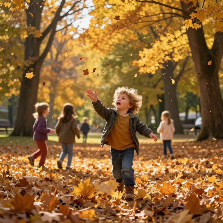 Kidd depicted as a playful character in a lively autumn park, leaves falling around, kids playing, warm golden sunlight filtering through trees, photorealistic style with a touch of impressionistic brushwork