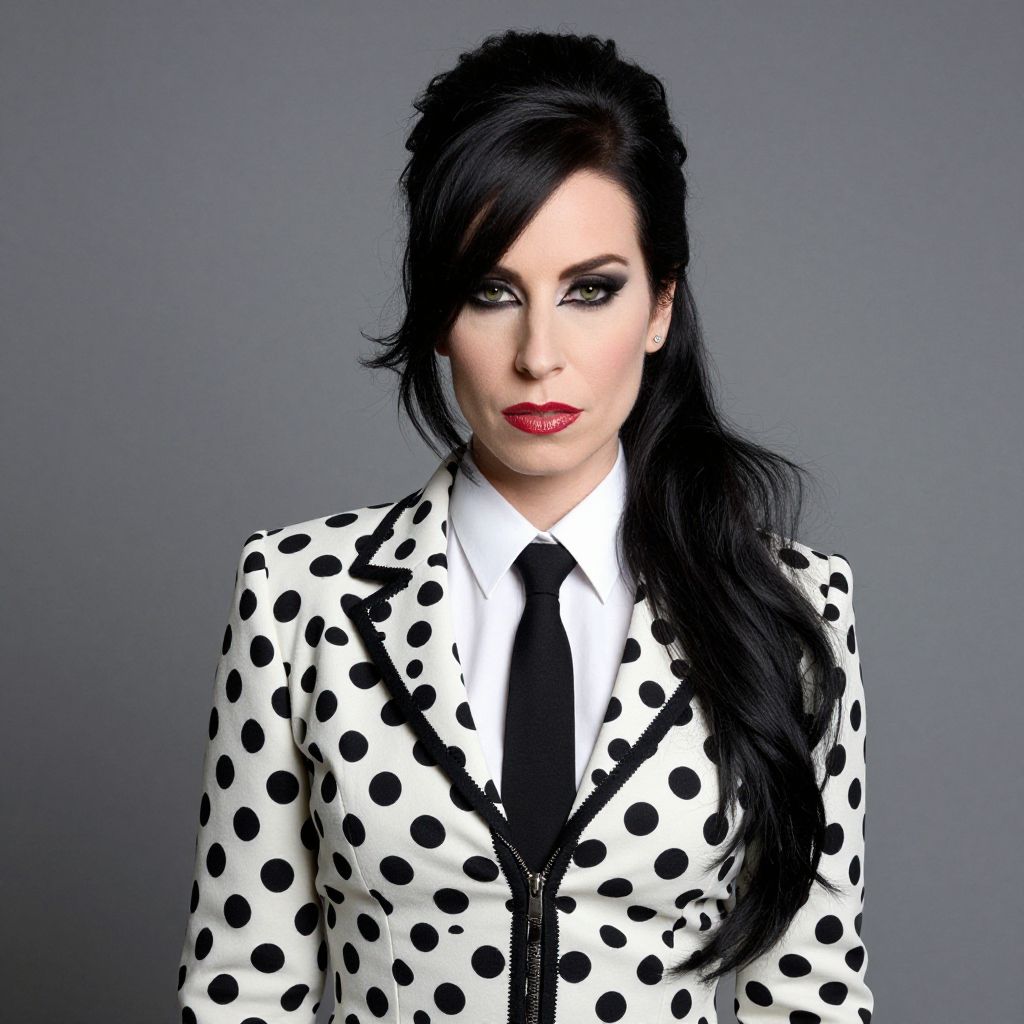 Photograph of a pale-skinned woman with striking black hair styled in a side-swept, voluminous ponytail. She has bold, dark eye makeup with smoky eyeshadow and vivid red lipstick. She wears a white blazer with large black polka dots, a crisp white shirt, and a black tie. The background is a solid, muted gray, making her outfit and features stand out prominently. The overall style is modern and edgy, with a strong, confident presence. The image has a high contrast and sharp focus, highlighting the textures of her hair and clothing.
