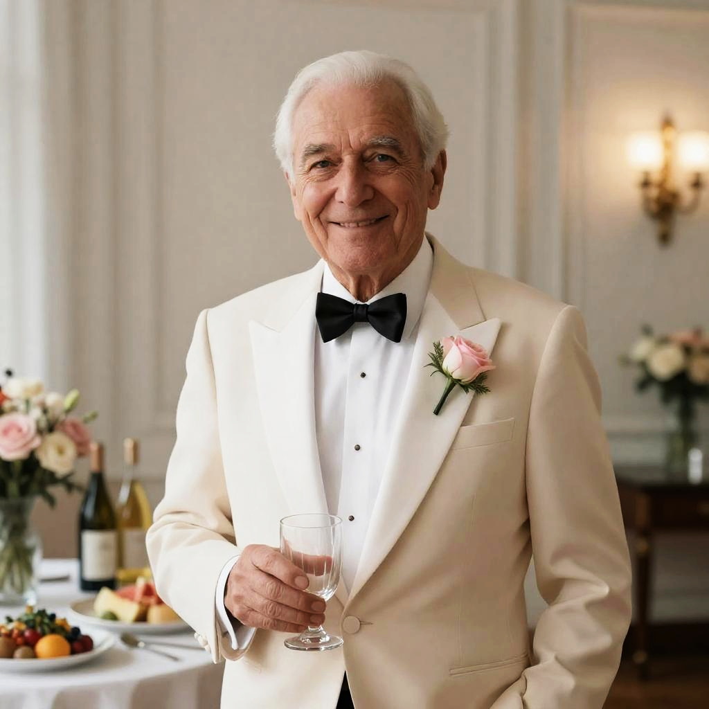 Elderly man in beige tuxedo with white lapels, black bow tie, and pink boutonniere, smiling, holding a glass. Background: elegant room with white curtains, soft lights, buffet table with dishes, bottles, and flowers. Gentle, warm lighting.