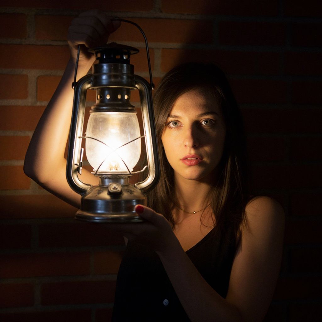 Woman holding a glowing vintage gas lamp illuminates her face against a brick wall backdrop, casting warm light and creating a dramatic portrait.
