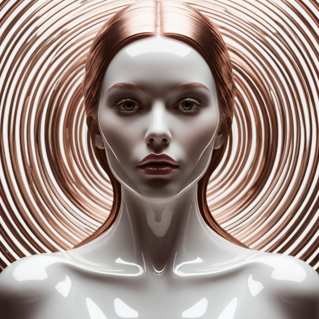 Ultra-detailed 3D rendered female bust symmetrically centered with subdued rose gold hair and pearl white glossy skin. The model features captivating facial details with smooth contours, striking reflections, and transparent flowing elements. The ethereal background consists of spiraling rose gold rings enhancing spatial depth and adding a modern, artistic play of light and shadow.