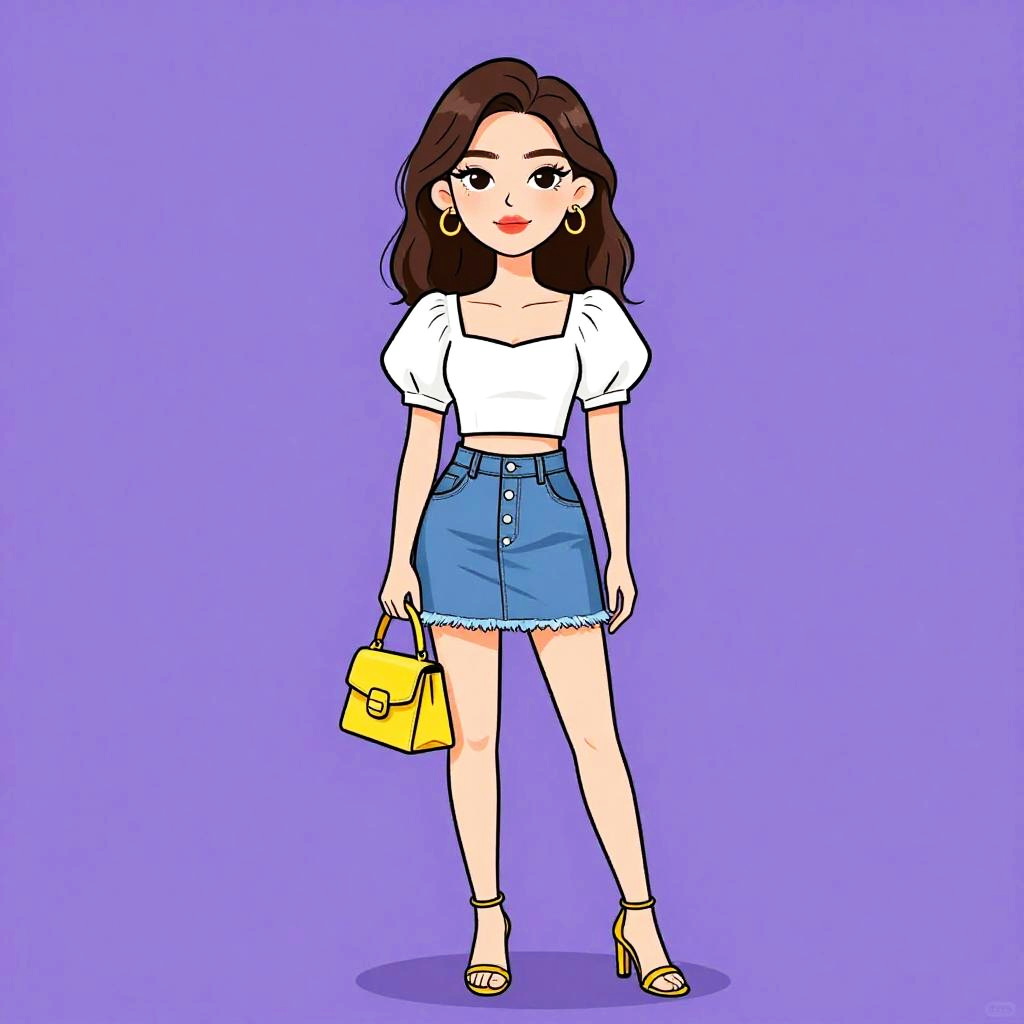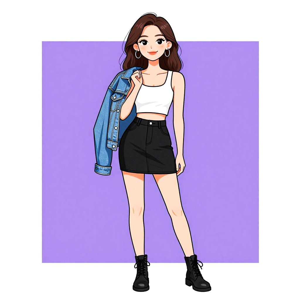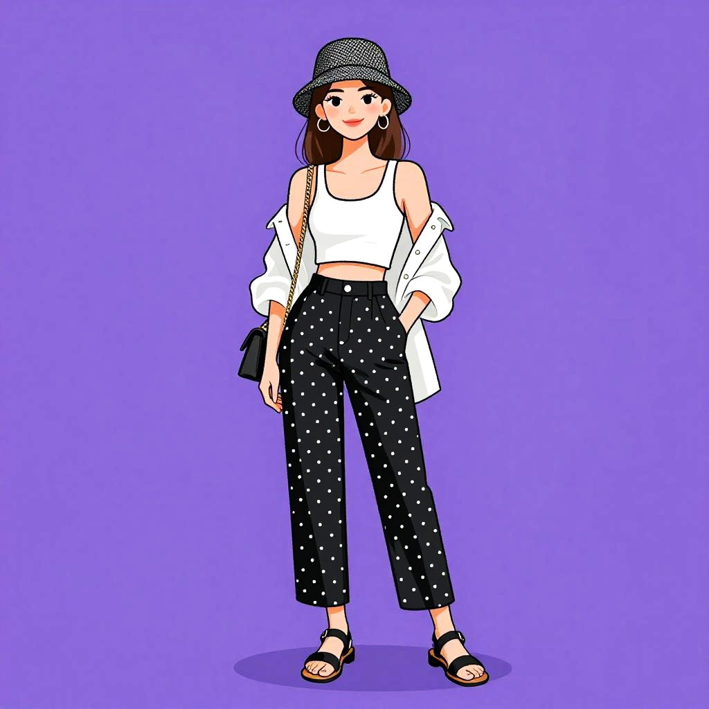 Illustration of a woman with long brown hair styled half-up half-down wearing a black cropped tank top paired with high-waisted wide-leg trousers featuring a red, black, and white houndstooth pattern. She accessorizes with matching houndstooth patterned earrings and slip-on flat sandals. The woman has minimal makeup and stands against a simple purple studio background.