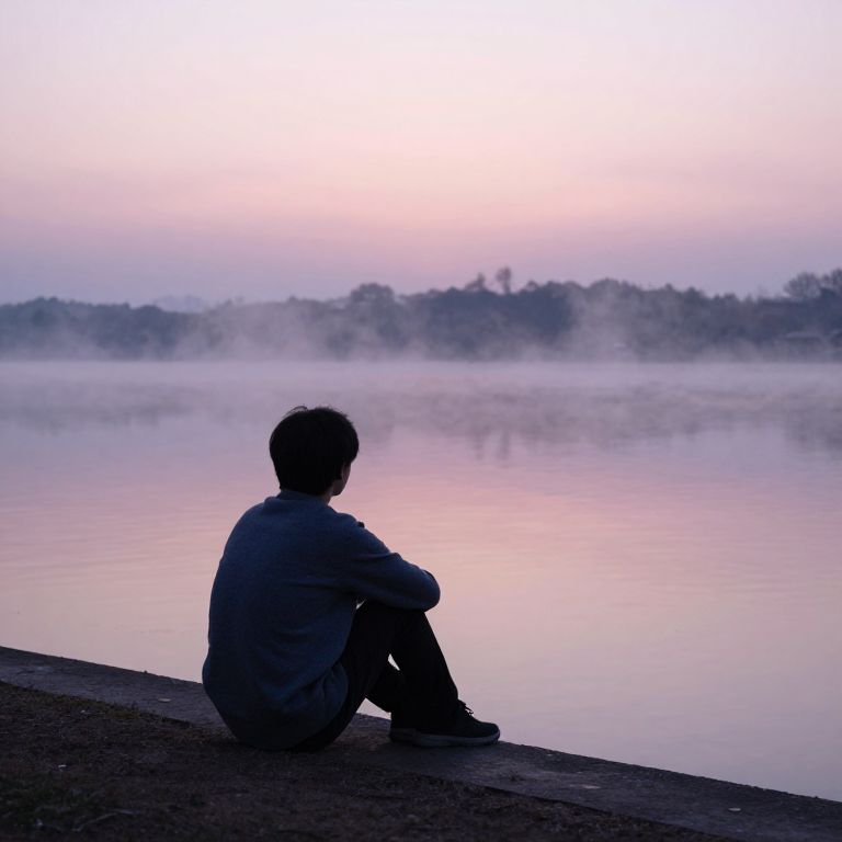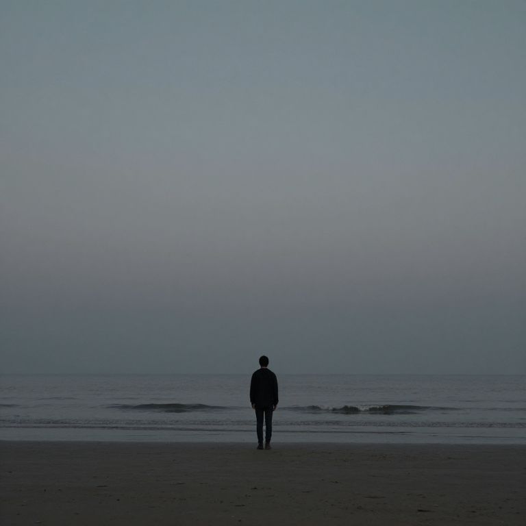 A conceptual abstract image of loneliness, shown through a lone figure standing on a desolate beach at dusk, with the horizon blending into a muted palette of grays and blues, evoking a deep sense of isolation.