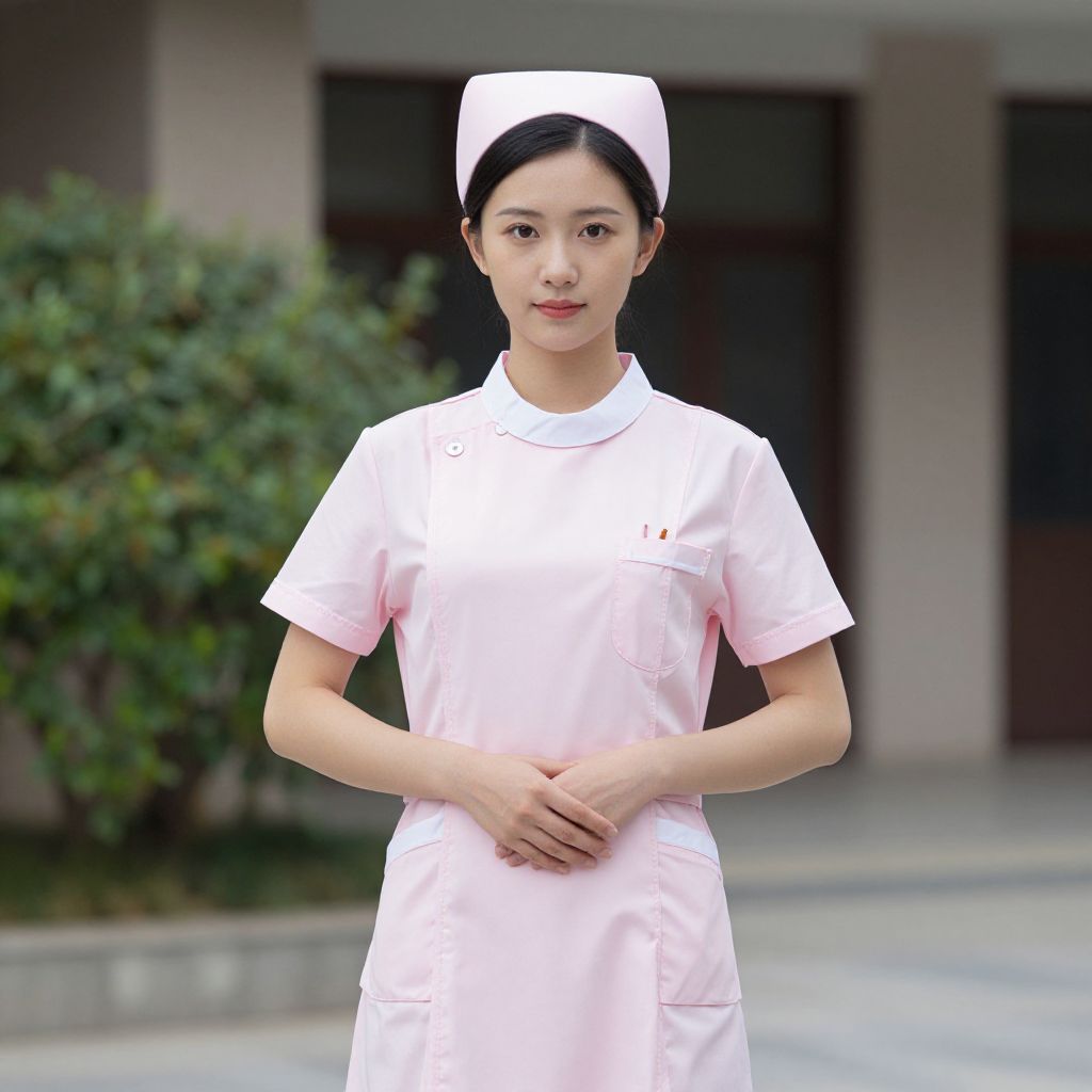 "Work Appropriate Costume Nurses, female nurse in a pink uniform standing in front of a building"