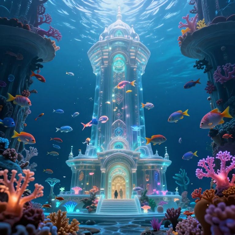 A majestic viszal underwater palace with translucent walls, illuminated by bioluminescent coral and schools of colorful fish, viszal creatures swimming gracefully, fantasy style with intricate details and a soft glowing ambiance, ultra-realistic rendering.