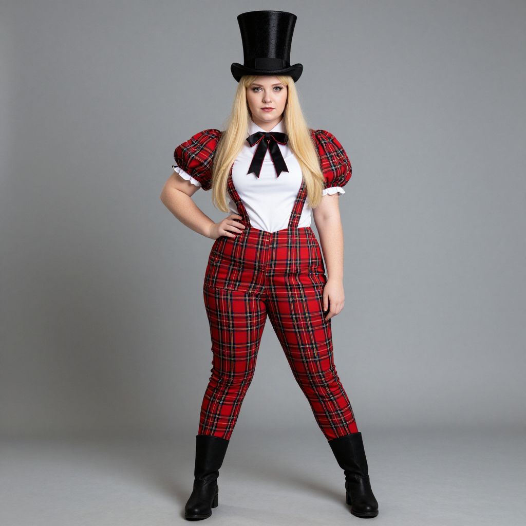 Plus size mad hatter costume, solo, hat, 1girl, top hat, long hair, pants, hand on own hip, blonde hair, boots, standing, plaid, full body, red pants, puffy sleeves, bow