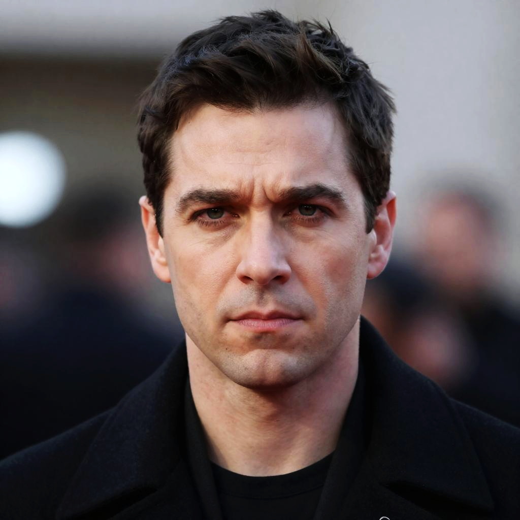 Photograph of a man with short brown hair, wearing a black button-up shirt, sitting and speaking into a microphone. Background has a green, grid-like pattern with silhouettes of two people. He has a slightly intense expression. Smoke rises from his hands. Microphone cord is visible.