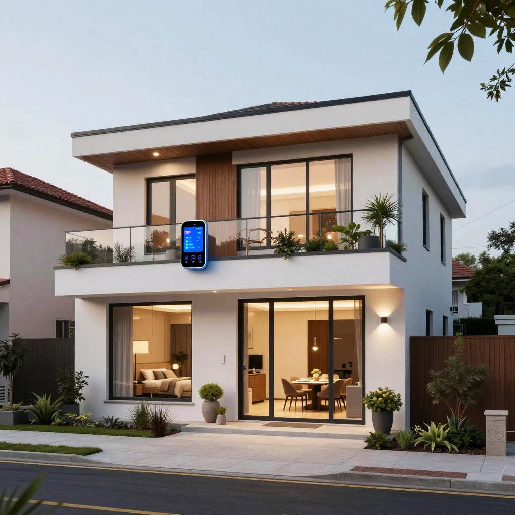 Photograph of four modern two-story houses at dusk, each with large glass windows, black and white exteriors, illuminated interiors, and outdoor seating areas