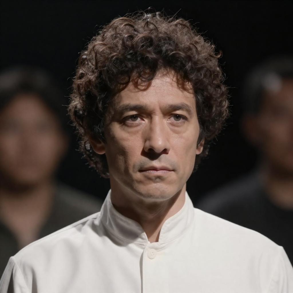 Photograph of a middle-aged man with curly brown hair, shadowed face, and intense expression. He wears a white shirt with a high collar, and the background is dark with blurred, indistinct shapes. Light creates dramatic shadows on his face.
