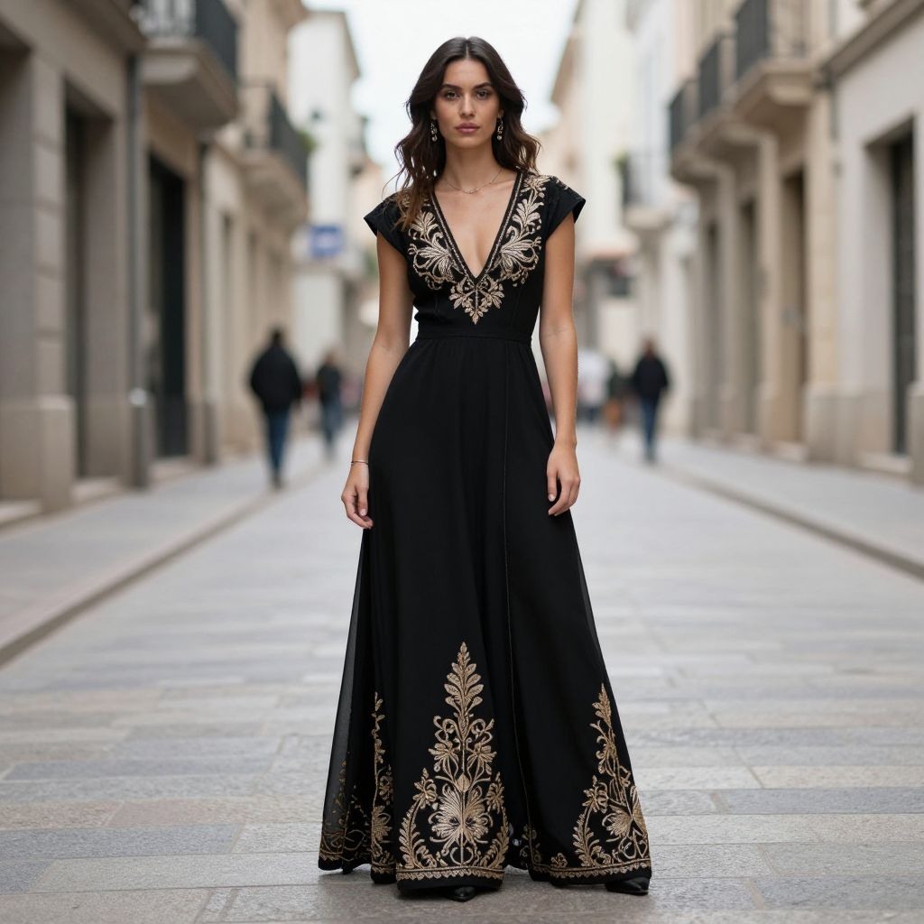 Photograph of a tall, slender woman with long, wavy brown hair and fair skin, standing confidently on a narrow, cobblestone street. She wears a black, floor-length gown with a deep V-neck and intricate gold embroidery along the neckline, sleeves, and hem. The background shows blurred pedestrians and buildings with balconies, suggesting an urban European setting. The lighting is natural, highlighting the elegant details of her dress and the street's stone texture. The overall style is chic and sophisticated, with a focus on the intricate embroidery and the model's poised stance.
