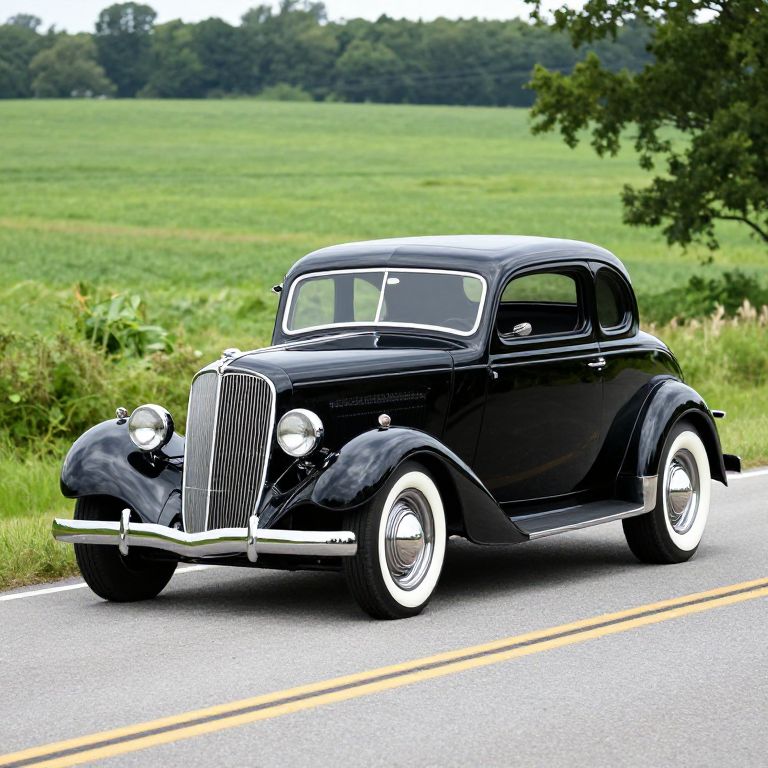 Gleaming black 1938 Chevrolet Business Coupe hot rod cruising down a rural road, showcasing its polished chrome accents, whitewall tires, and classic grille design against a backdrop of lush green fields and trees.