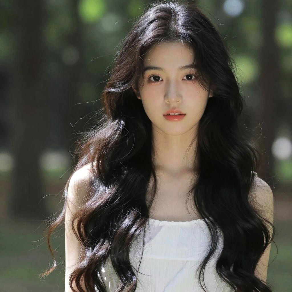 Photograph of an East Asian woman with long, wavy black hair and fair skin, standing in a sunlit forest. She wears a simple, white, strapless top that contrasts with her dark hair. Her expression is neutral, with slightly parted, natural pink lips. The background is blurred, featuring dark tree trunks and patches of green foliage, creating a serene, natural setting. Soft sunlight filters through the trees, highlighting her hair and face. The image has a slight, digital, airbrushed effect, enhancing her smooth skin and delicate features.