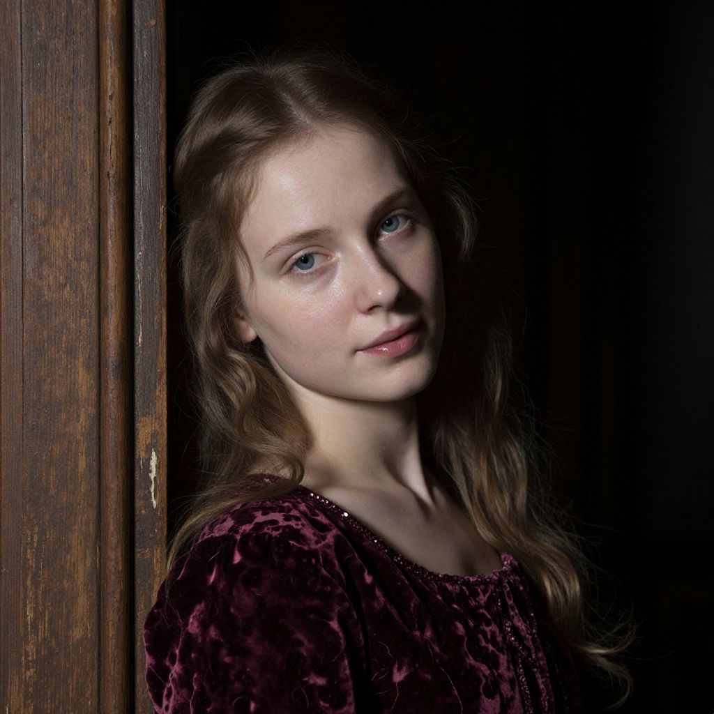 Craft a hyperrealistic portrait reminiscent of Rembrandt's chiaroscuro lighting technique, showcasing a young Slavic woman with porcelain skin and piercing blue eyes in a three-quarter view from an elevated angle. Positioned against a distressed wooden doorframe, her cascading hair frames one shoulder. Delicately capture the nuances of her expression, hinting at both vulnerability and strength through a subtle smile playing at the corners of her lips. Masterfully render the interplay of light and shadow, casting dramatic highlights across her face and accentuating the intricate details of her deep burgundy velvet dress.