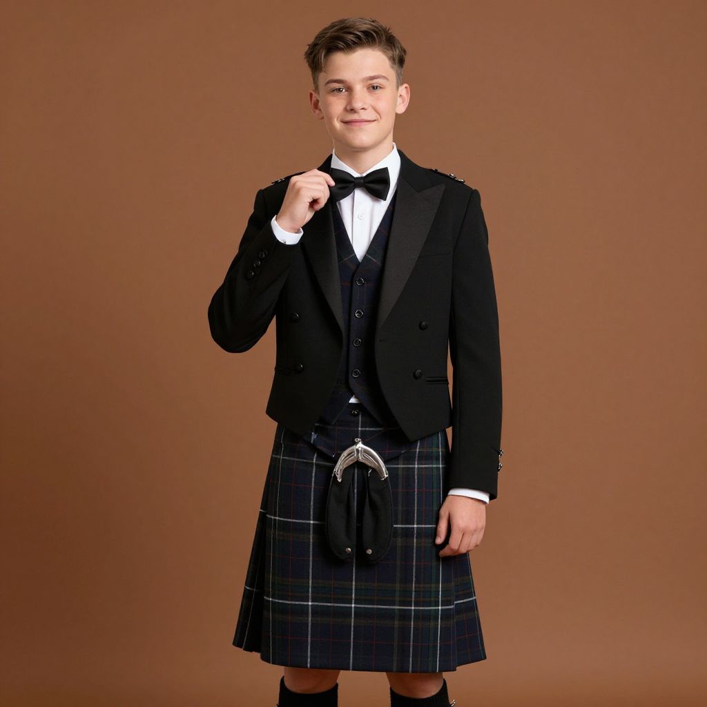 Photograph of a young Caucasian boy with short brown hair, standing against a plain brown background. He is wearing a traditional Scottish outfit, including a black velvet jacket with a white shirt, black bow tie, and a black and green checkered kilt. His left hand is raised to his bow tie, and his right hand rests by his side. He has a slight smile on his face and is looking directly at the camera. The kilt has a silver sporran at the front. The image is well-lit, highlighting the textures of the velvet jacket and the checkered pattern of the kilt.