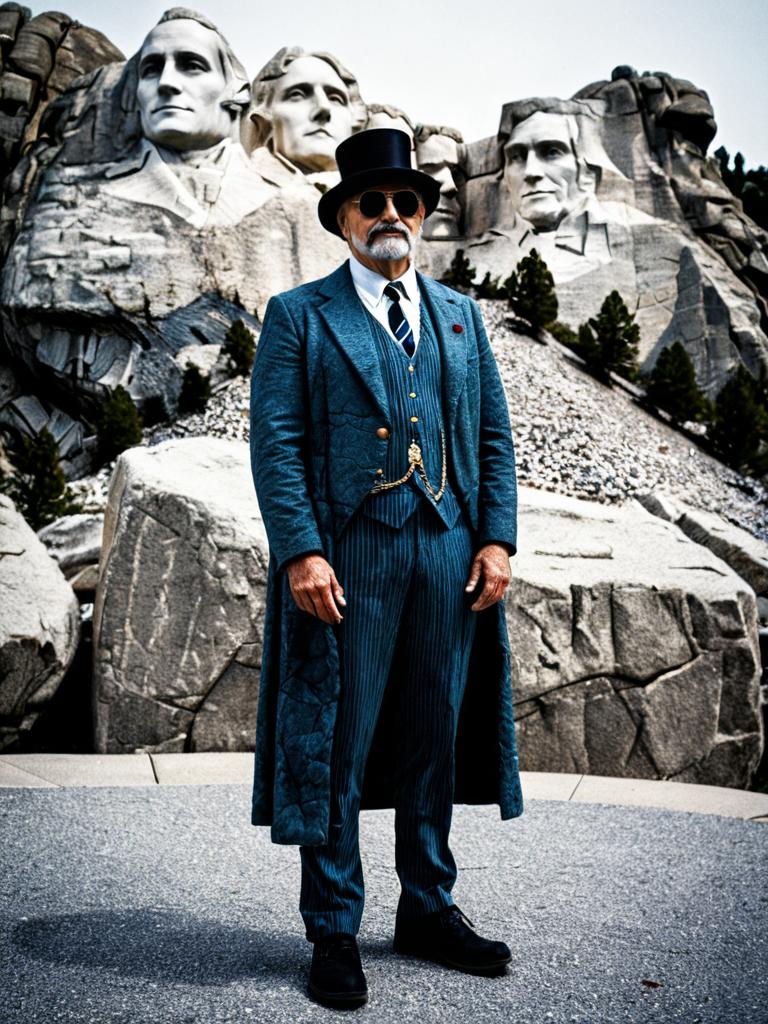 Full-body portrait of a man dressed in a detailed Mount Rushmore costume with stone texture effects. The man wears a blue suit, white shirt, red striped tie, and sunglasses, standing confidently in front of the Mount Rushmore National Memorial backdrop surrounded by trees and large rocks.
