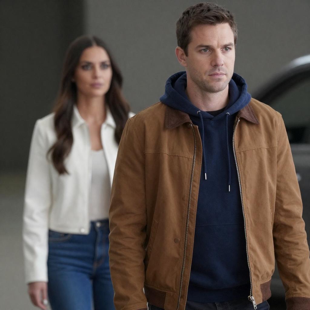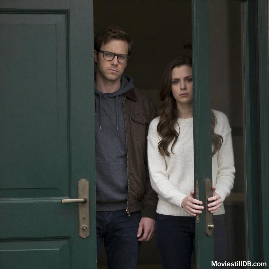 Photograph of a man and woman standing in a doorway. Man with brown jacket, gray hoodie, and glasses, serious expression. Woman with long brown hair, white sweater, serious expression. Green door on left, glass door on right. Both hold door handles. Dark background. "MoviestillsDB.com" in bottom right corner.