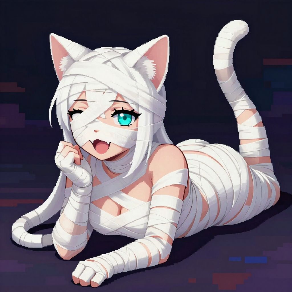 Pixel art, 64 bit, best quality, masterpiece, professional photograph shot, 1girl, Beautiful, Very Beautiful, Very Very Beautiful, (Anime Style of a A white mummy catgirl with white bandages instead of clothes lies on her stomach, and her hair covers one of her beautiful turquoise eyes. Bows of bandages on the back and raised feet. She is smiling and her skin-colored fangs, her mouth is open. She uses her hands to represent cat's paws. Beautiful white fluffy tail with abstract dark background:1.8), cinematic, hd, 4k, 8k, highly detailed, trending artstation, Pixelate, Hard Light, colorful, abstract dark background, mummy style, sexy attire, catlingerie