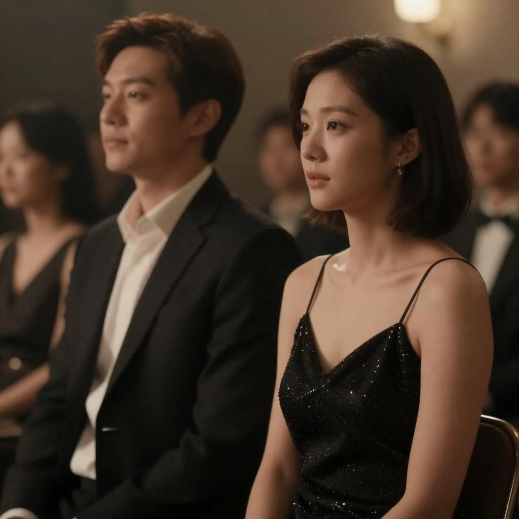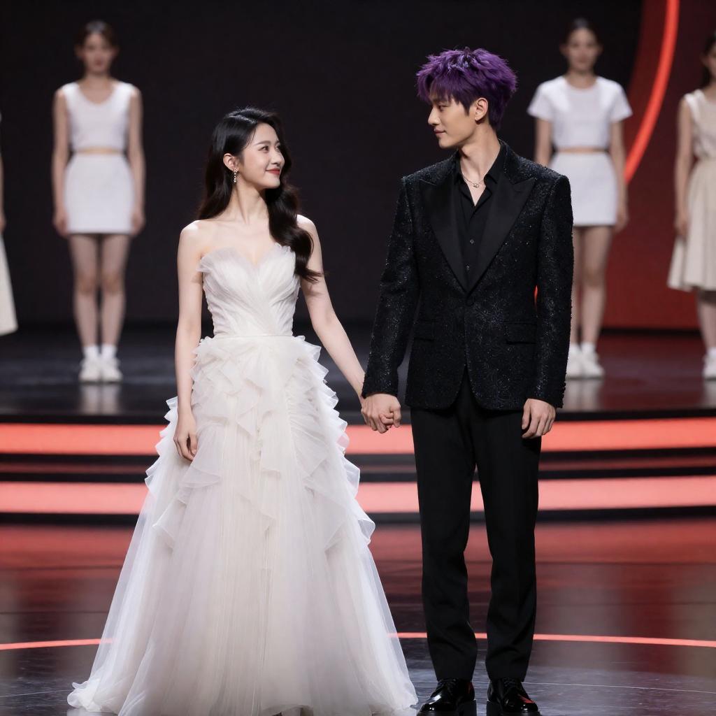 Portrait of an Asian woman with long dark hair wearing a red dress with black and red feathered shoulders sitting next to an Asian man with light brown hair dressed in a black leather jacket and black shirt. They are in the front row at an event with other blurred attendees in the background and red and white decorations.