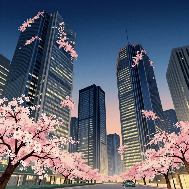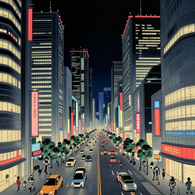 A futuristic cityscape at night, reminiscent of Japanese ukiyo-e woodblock prints, features towering skyscrapers illuminated by vibrant neon lights. The bustling street below is filled with advanced vehicles and androids, creating a striking visual narrative that reflects both nostalgia and innovation. This unique fusion of traditional Japanese aesthetics with high-tech elements challenges viewers to imagine a world where the past seamlessly blends with the future, evoking a sense of wonder and intrigue.