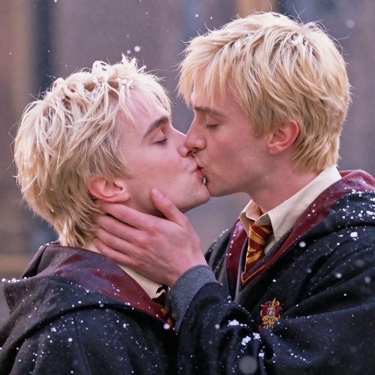 Draco Malfoy kiss under moonlight, enchanting Hogwarts courtyard, dramatic lighting, gentle yet intense moment, magical atmosphere, intricate costume details, fan art illustration