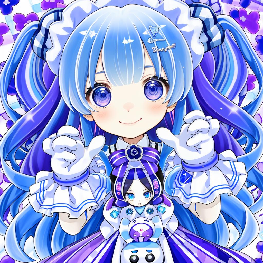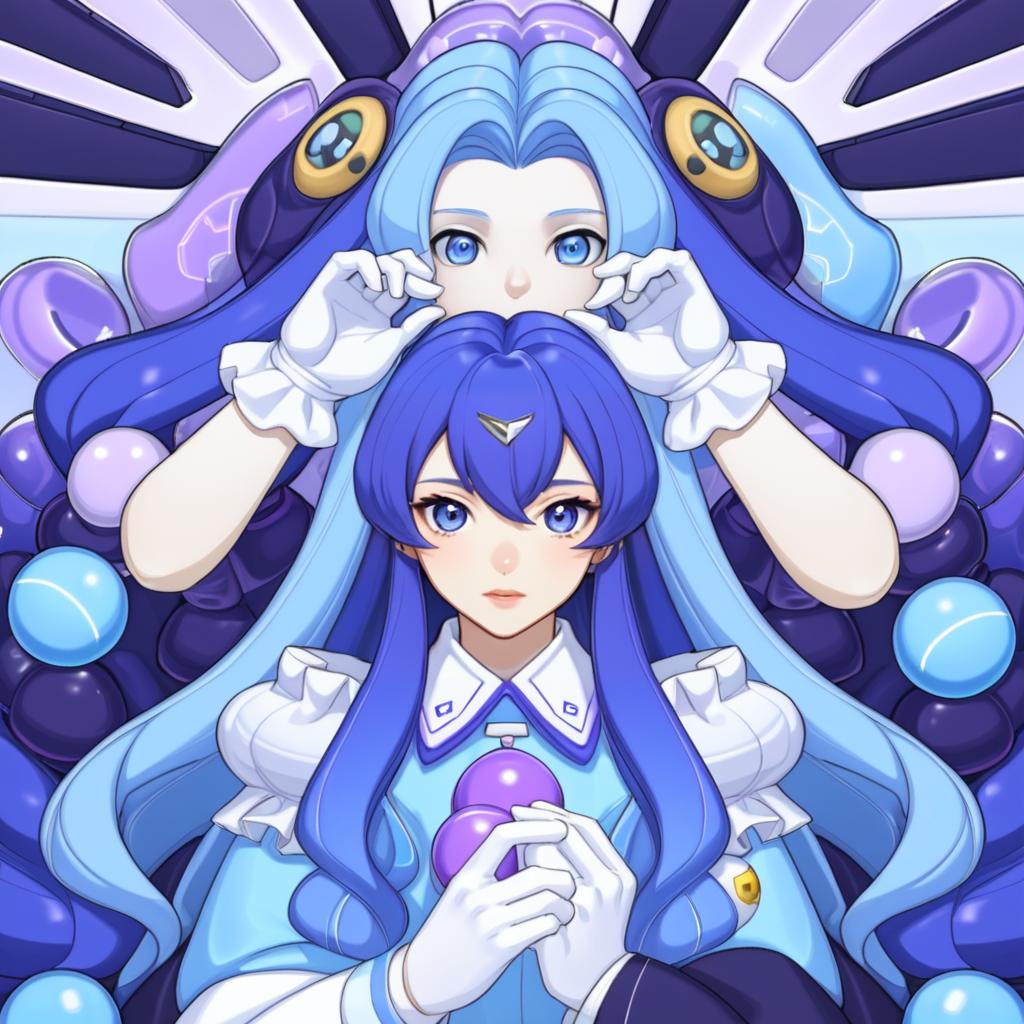 Digital anime-style artwork featuring two characters with long blue hair and striking blue and purple eyes. Both wear white gloves and light blue outfits with detailed collars. The background includes abstract purple and blue shapes, enhancing the vibrant composition.